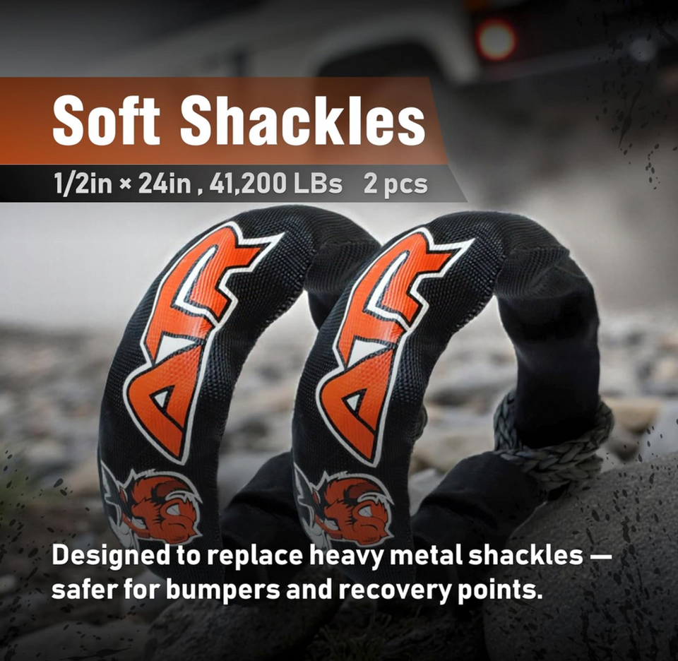 - 🛠️ COMPLETE 4-IN-1 RECOVERY KIT – BUILT FOR EXTREME OFF-ROAD Get everything you need in one heavy-duty off-road recovery kit: 3.5”x8ft Tree Saver Strap (36,000 lbs) + two ½”x24” Soft Shackles (41,200 lbs) + Recovery Ring (66,000 lbs). Designed to handle winching, towing, stuck-vehicle recovery, mud, sand, snow & trail emergencies.